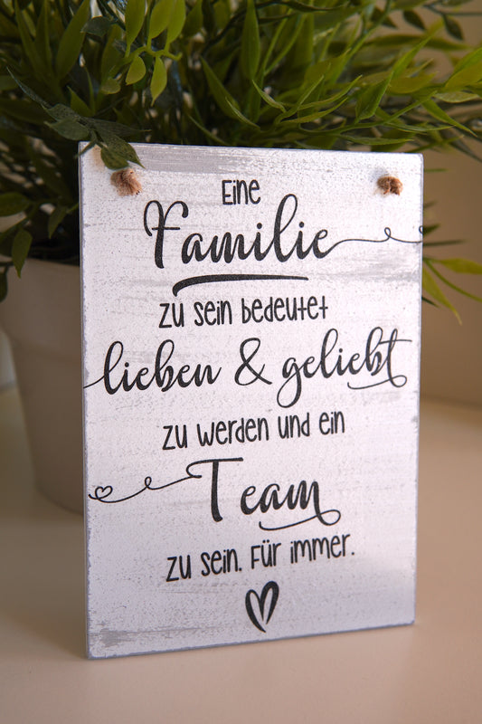 Spruchschild DIN A6 - Eine Familie zu sein bedeutet lieben und geliebt zu werden und ein Team zu sein. Für immer.