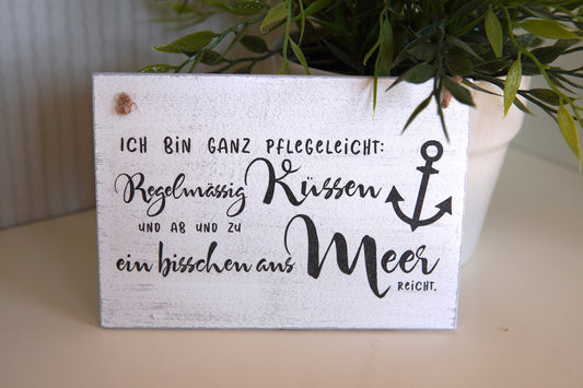 Spruchschild DIN A6 - Ich bin ganz pflegeleicht: Regelmässig Küssen und ab und zu ein bisschen ans Meer reicht.